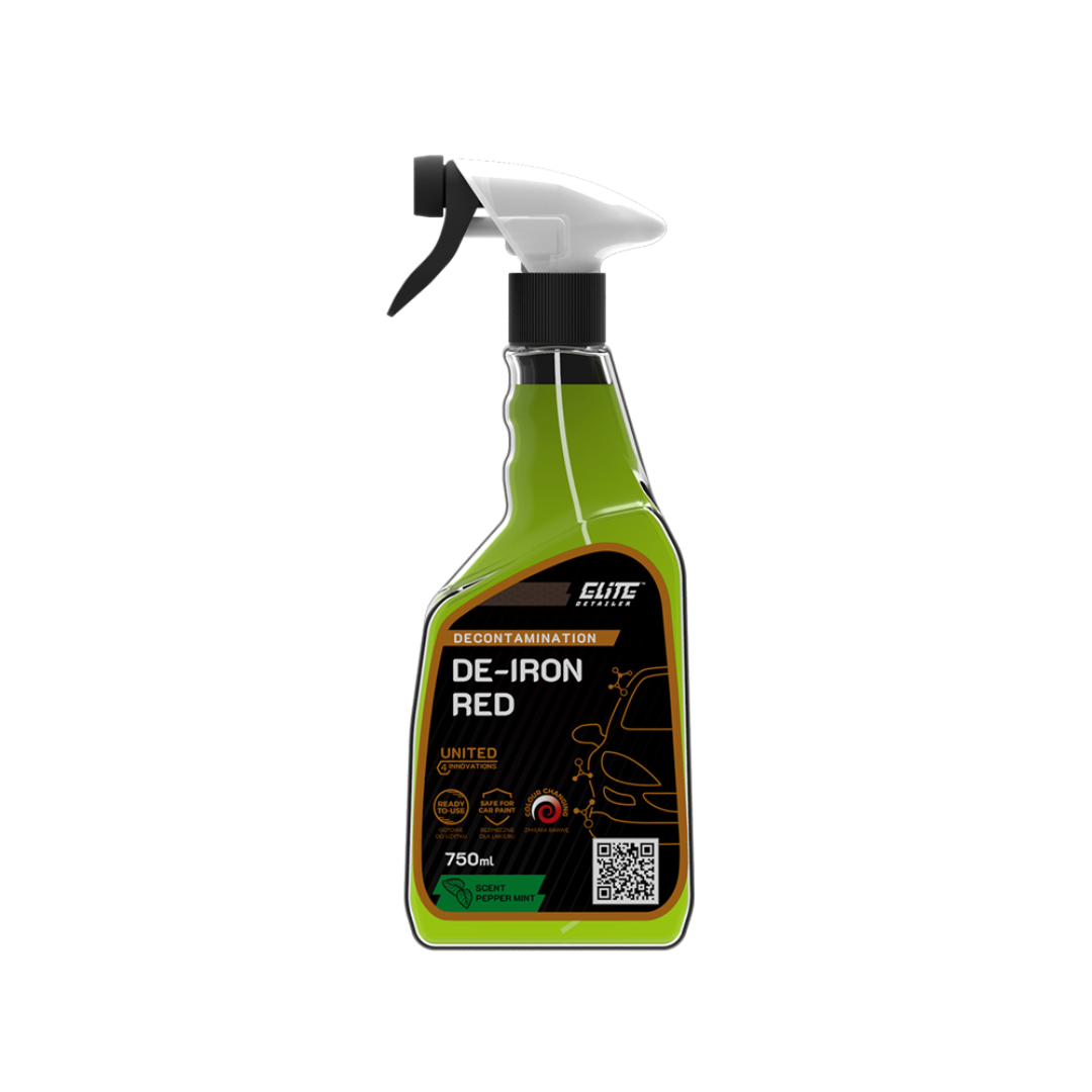 DE-IRON RED is a ready-to-use iron remover designed to safely dissolve metallic contamination and brake dust from vehicle surfaces. The advanced reactive formula breaks down embedded iron particles and produces a visible bleeding effect, indicating active decontamination.