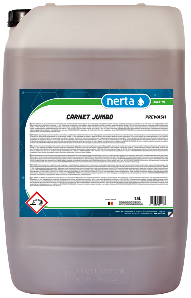 Unlike the majority of alkaline cleaners CARNET JUMBO is non corrosive and has exceptional soaking power to safely clean all types of vehicles. it is easy to rinse and leaves a water repellent, shiny finish.